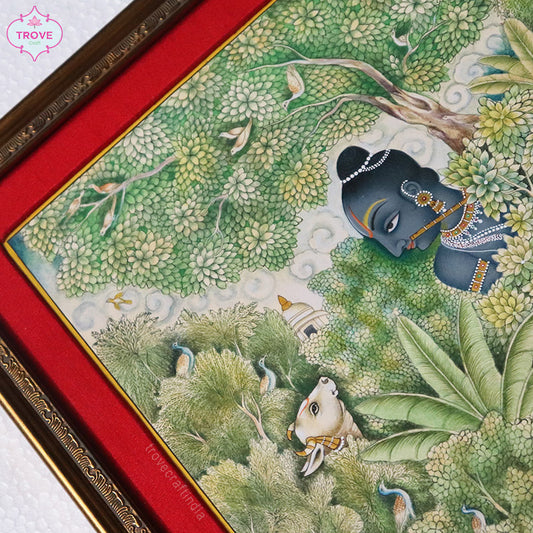 Framed Krishna in Jungle Contemporary Pichwai Painting