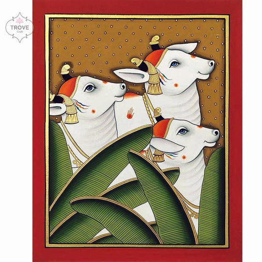 Right Facing Cow on with banana leaves Pichwai Painting - 12 x 16 inch
