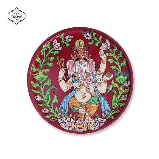 12" Lord Ganesha Pattachitra Wall Decor Plate (Cherry Red Background)