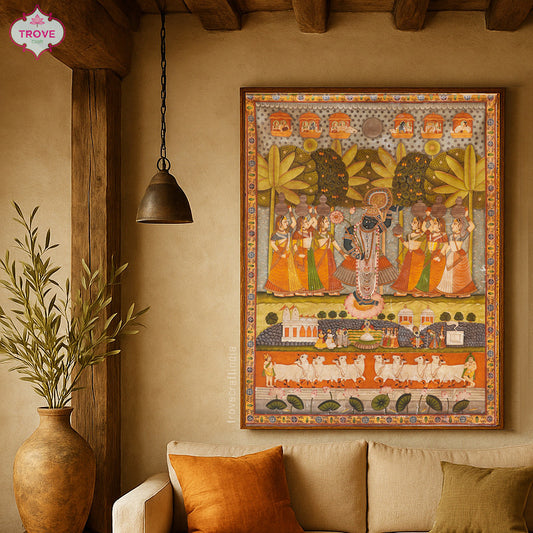 Unique Wooden Jharoka Decor Framed Pichwai Theme 24"x 36"