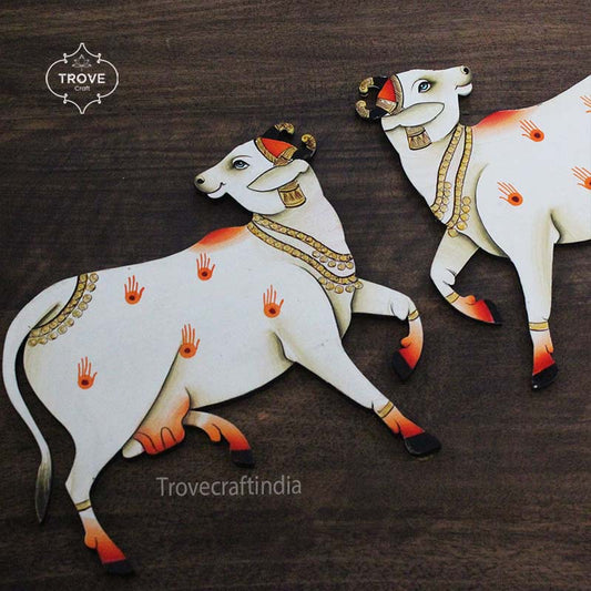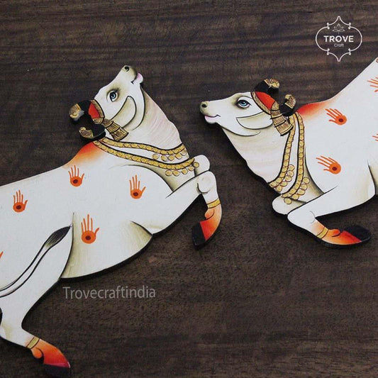 Set of 2 pichwai cow MDF cutouts in white - Walking