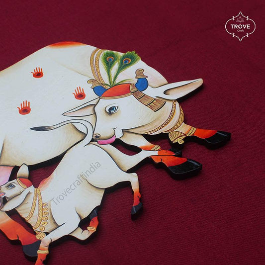 Pichwai cow and calf MDF cutout in white - Right Facing