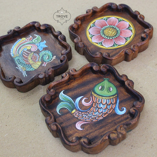 Set of 3 Hand painted kalamkari Peacock, Lotus & Fish on carved wooden plaques