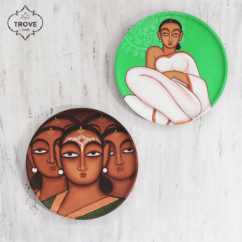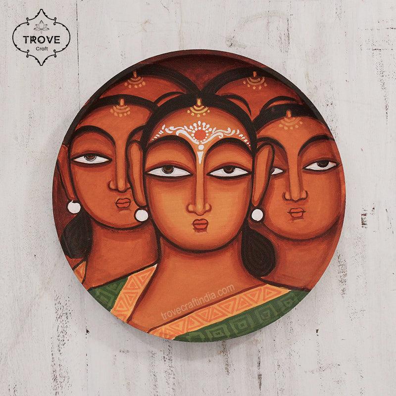 10-inch hand-painted wall decor plate painted in the Kalighat style featuring women dressed in the traditional Bengali style, in two variants.