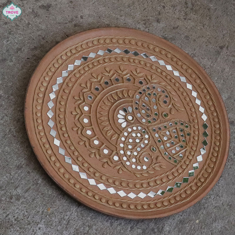 Lippan is a traditional style of wall decoration from Kutch in Gujarat, and uses small pieces of mirrors and clay to create striking geometric patterns on the interior walls of homes. Lippan rarely uses paint, relying more on elaborate mirror-work and patterns to offset the colour of the raw clay.