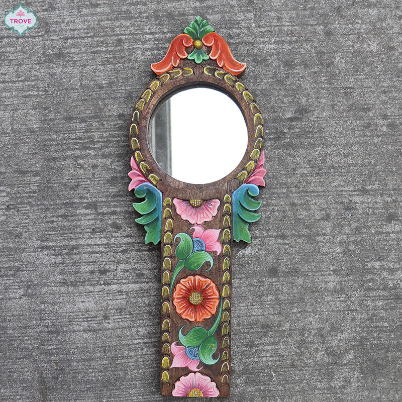 This hand-carved wooden mirror frame is inspired by the traditional coconut graters used in many south Indian households, with a floral hand-painted detail inspired by kalamkari painting.