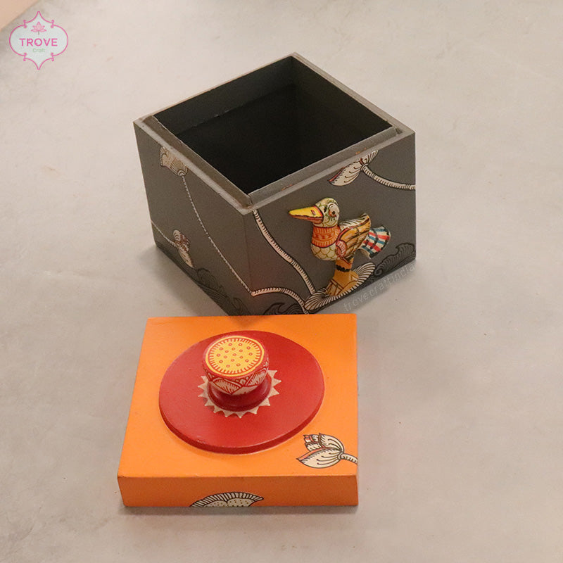 Hand-Painted Pattachitra Boxes in quirky colors! with a 3d Hand-painted wooden element to give it a fun pop!