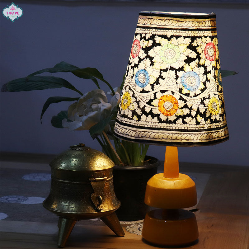 | cylendrical lampsahde | Hand-painted Tholu lamps | Hand-painted Tholu lights | handpainted desktop lampshade | homedecor | Indian string lights | leather puppets | Lighting range | table decor | Tholu art | Tholu Bommalata lights | tholu cylindrical lampsShare